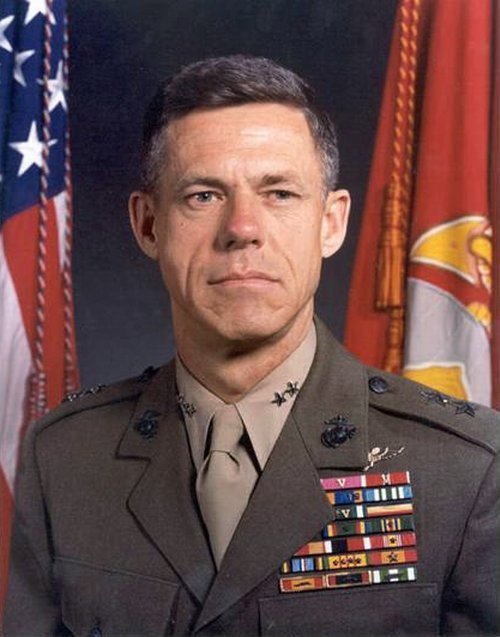 In 1973 John attended the National War College in Washington, D.C. During this same time frame, he also earned a Master of Science degree in international affairs from George Washington University. Graduating from his one-year course of instruction at the War College in 1974, he reported to Headquarters Marine Corps for a three plus year tour. During this tour John was instrumental in leading the charge to establish Marine Aviation Weapons and Tactics Squadron One (MAWTS-1) at MCAS Yuma, greatly enhancing pilot proficiency, safety, and operational readiness across Marine aviation. At the completion of this tour in 1978, John completed a training track at MCAS Cherry Point and MCAS Yuma flying the A-4, TA-4, OV-10 Bronco, CH-46 Sea Knight, and F-4J prior to reporting as the Assistant Wing Commander, 1st Marine Aircraft Wing, and Commanding General, 9th Marine Amphibious Brigade in Okinawa, Japan. Completing this tour in 1979, he went back to Washington, D.C., to serve as assistant chief of staff and the deputy chief of staff for research, development and studies at Headquarters Marine Corps. Following another cross-country move, John assumed command as Commanding General, MCAS El Toro in 1980. While there he flew the station UH-1 Huey. In May 1981 he became Commanding General, 3rd Marine Aircraft Wing, based in El Toro, and flew the F-4, A-4, A-6 Intruder, AH-1 Cobra, UH-1, CH-46, and the CH-53 Sea Stallion. Completing this command tour in May 1982, John reported as Director of Operations, J-3, at CINCPAC, Camp Smith, Hawaii, in June. He served in this capacity until his retirement from active duty on 1 July 1985.